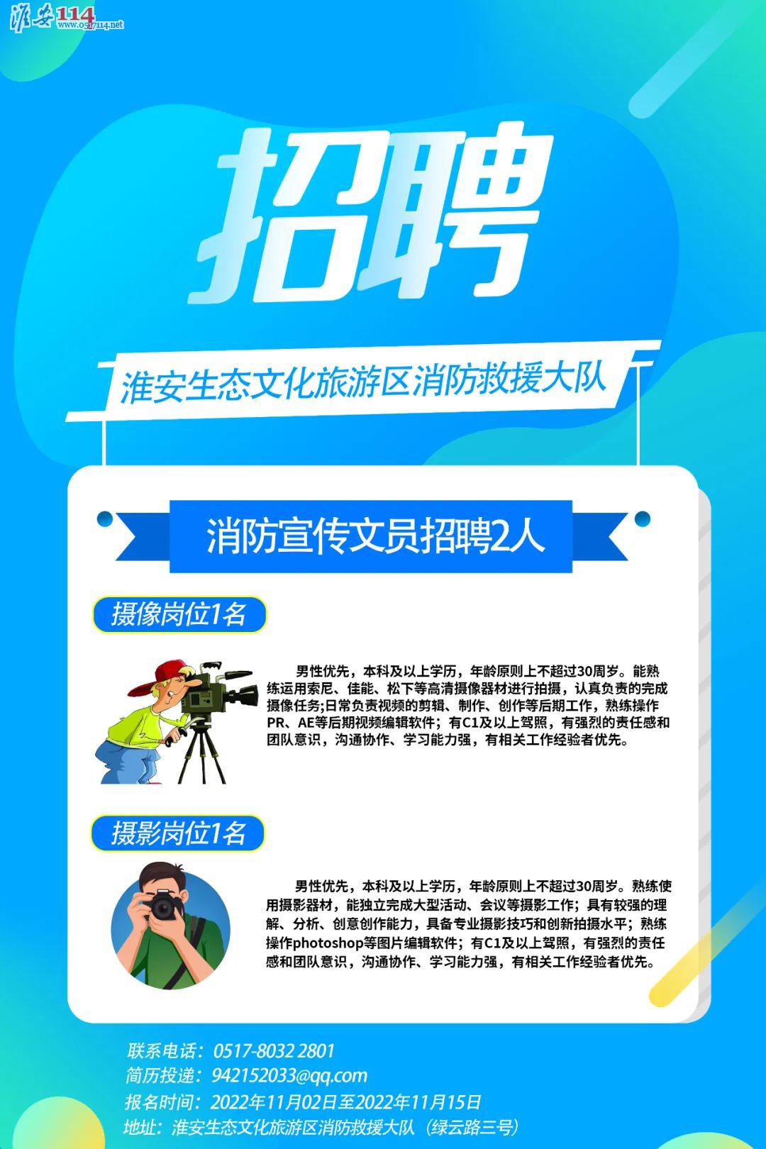 淮安生態(tài)文化旅游區(qū)消防救援大隊(duì)招聘消防宣傳文員2名(攝像、攝影)