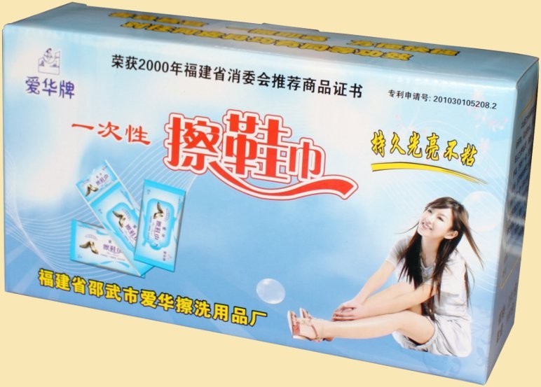 擦鞋巾(也稱擦鞋紙):愛華牌一次性高級擦鞋巾,對皮鞋面上的泥土具有很強(qiáng)的去污功效,無需鞋油鞋刷,對各色皮鞋、皮衣一擦即亮(無需象用鞋油鞋刷那樣反復(fù)擦刷才會亮),而且效果比用鞋油更光亮,光亮更持久,不沾灰塵,并起護(hù)革作用,對運(yùn)動(dòng)鞋也具有很好的去污功效。產(chǎn)品衛(wèi)生無毒,存放保質(zhì)期為兩年。